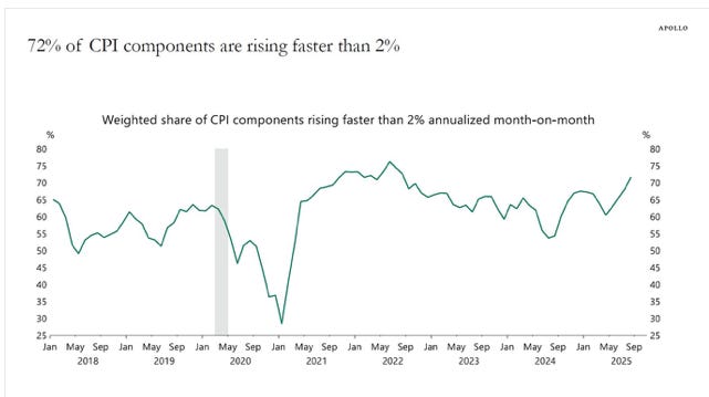 At the same time, 72% of the CPI components are growing faster than the Fed’s 2% inflation target, see the second chart below.
