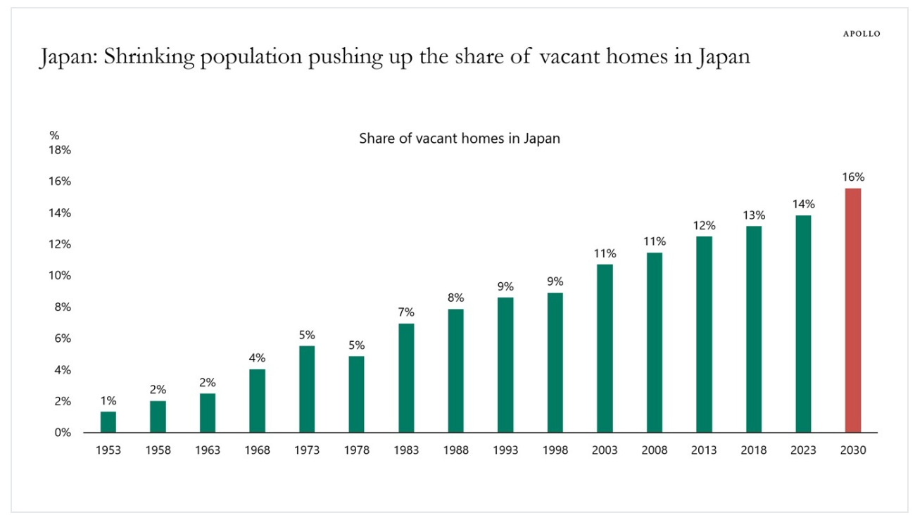 One consequence of a shrinking population in Japan is that there are more and more vacant homes, see chart below.