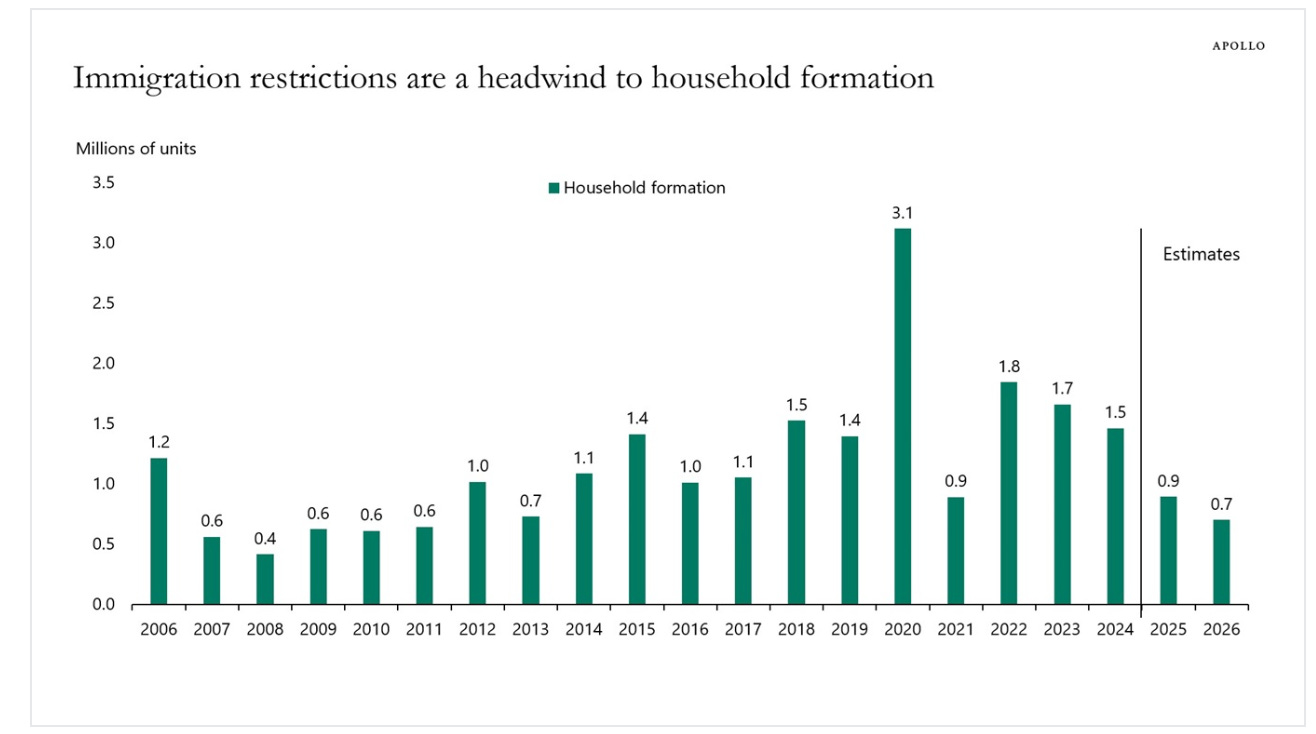 Household formation could decline by 50% from 2024 to 2026 due to deportations and immigration restrictions, see chart below and the Daily Spark here.