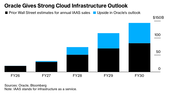 Oracle shares soared to a record after the company issued a bullish forecast for its cloud business, adding roughly $190 billion in market value and underscoring its emergence as a key supplier of infrastructure for AI developers such as OpenAI; cloud infrastructure revenue jumped 55% to $3.3 billion on the back of four multibillion-dollar contracts, with remaining performance obligations swelling to $455 billion, far above last year’s levels, as CEO Safra Catz projected the unit to grow 77% this year to $18 billion and reach $144 billion by 2030, a trajectory that highlights both surging AI demand and the steep data center investment—about $35 billion this year—that Oracle must shoulder to compete with Amazon, Microsoft, and Google in the race to power the world’s AI build-out.