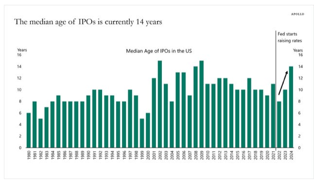The rise in the age of companies going public is not only a result of the Fed raising interest rates in 2022, but also the consequence of more companies wanting to stay private for longer to avoid the burdens of being public.