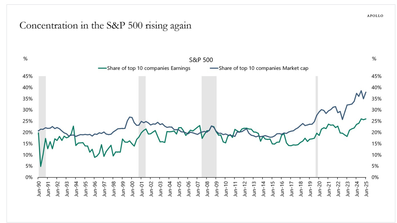 The concentration in the S&P 500 has returned to extreme levels, with the top 10 companies accounting for 40% of the index’s market capitalization and a record-high share of earnings, see chart below.