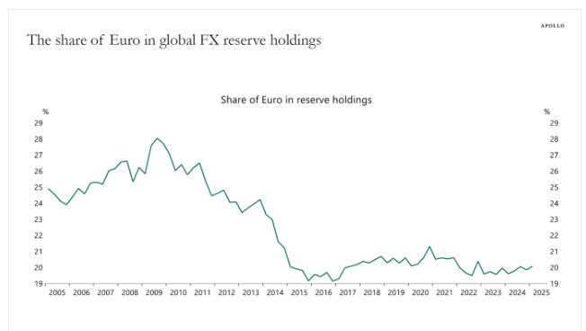 IMF data for global central bank FX reserves shows that the share of euros in global FX reserves is not going up and remains low at 20%, see chart below.