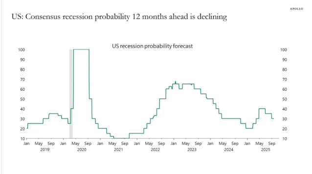 The consensus probability of a recession over the next 12 months continues to decline and currently stands at 30%, see chart below.