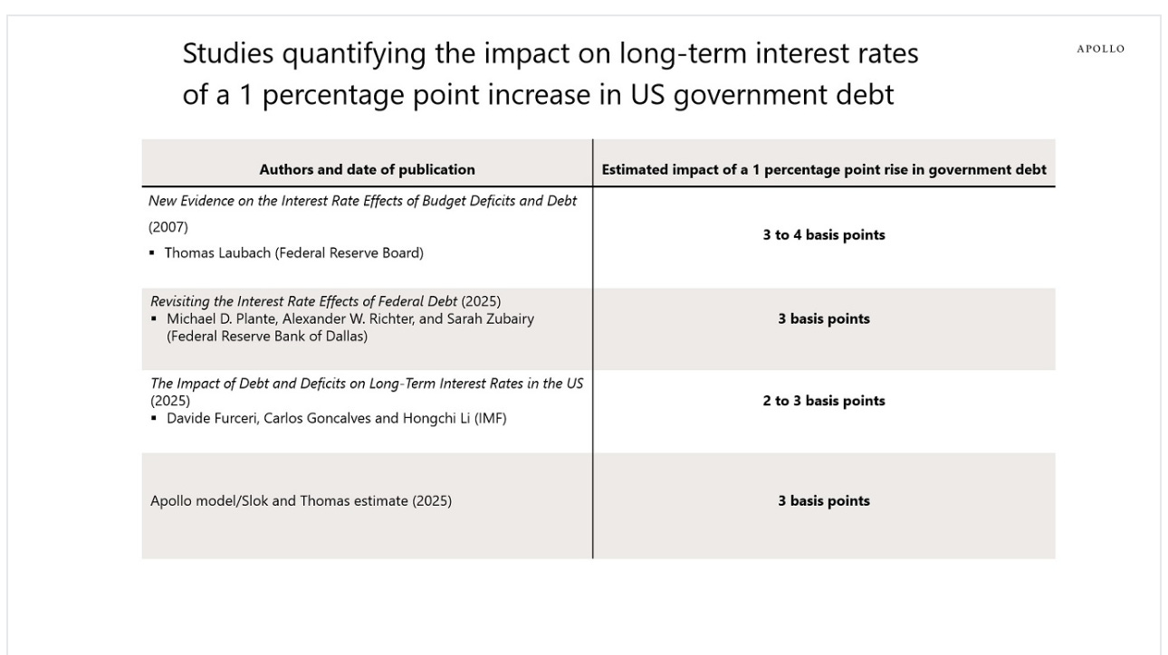 Academic papers quantifying the impact on 10-year interest rates of a one percentage point increase in US government debt-to-GDP find an effect of 3 basis points, see chart below.