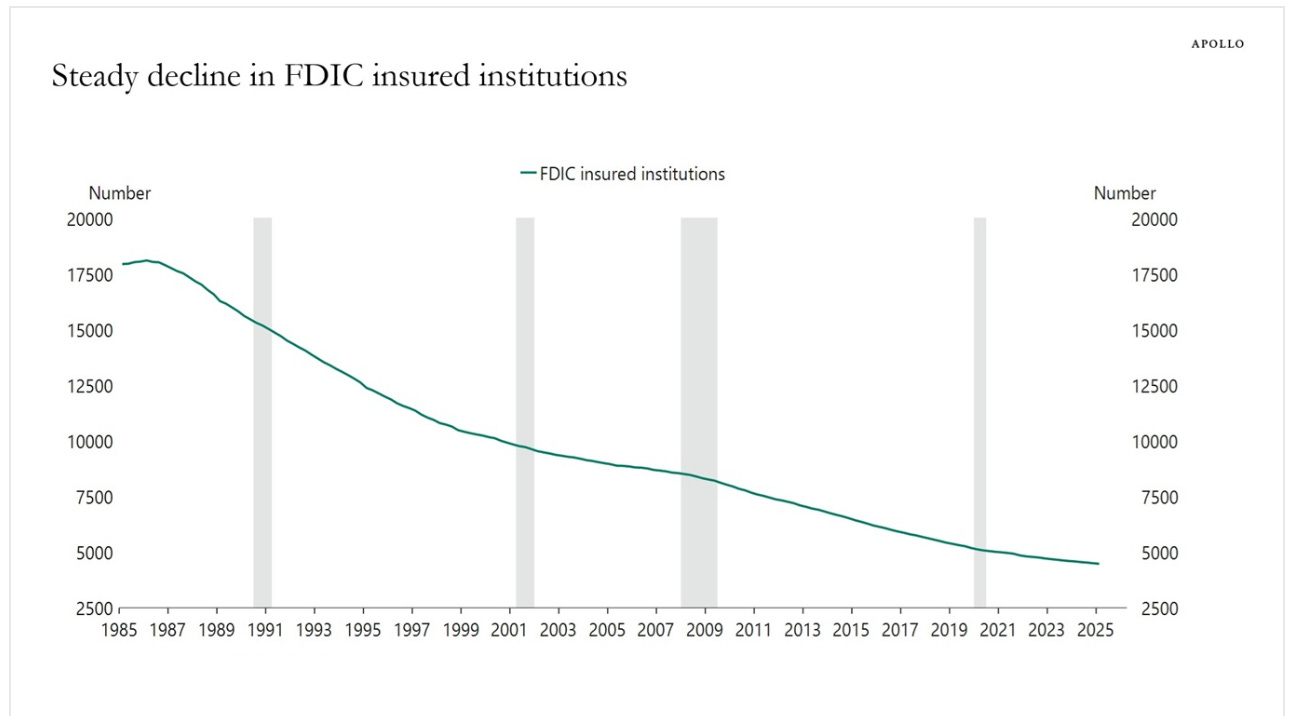 The number of banks in the US has declined significantly over the past 40 years, see chart below.