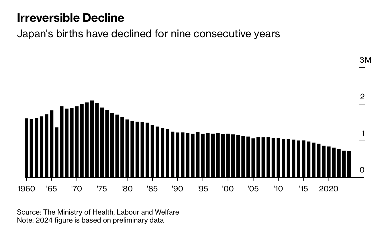 Japan’s working-age population peaked in 1995 and has been declining ever since. Despite government policies aimed at encouraging childbearing—subsidies, expanded childcare programs, aggressive matchmaking support—births continue to fall. While marriages edged up 2.2% to 499,999 in 2024, this came only after steep declines. And unlike in Western countries, only a few out of every 100 babies in Japan are born out of wedlock.