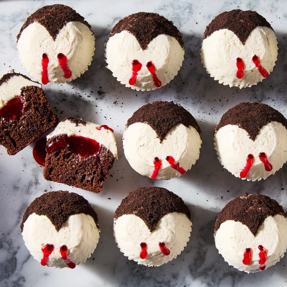 Indulge in these wickedly delightful vampire cupcakes—ideal for Halloween! These rich chocolate cupcakes feature a gooey strawberry jelly “blood” center, crowned with a light, fluffy marshmallow frosting, and adorned to mimic Dracula’s signature hairline. Enhanced with a splash of red gel food coloring and chocolate cookie crumbs, these spooky treats are guaranteed to impress everyone from kids to the young-at-heart!