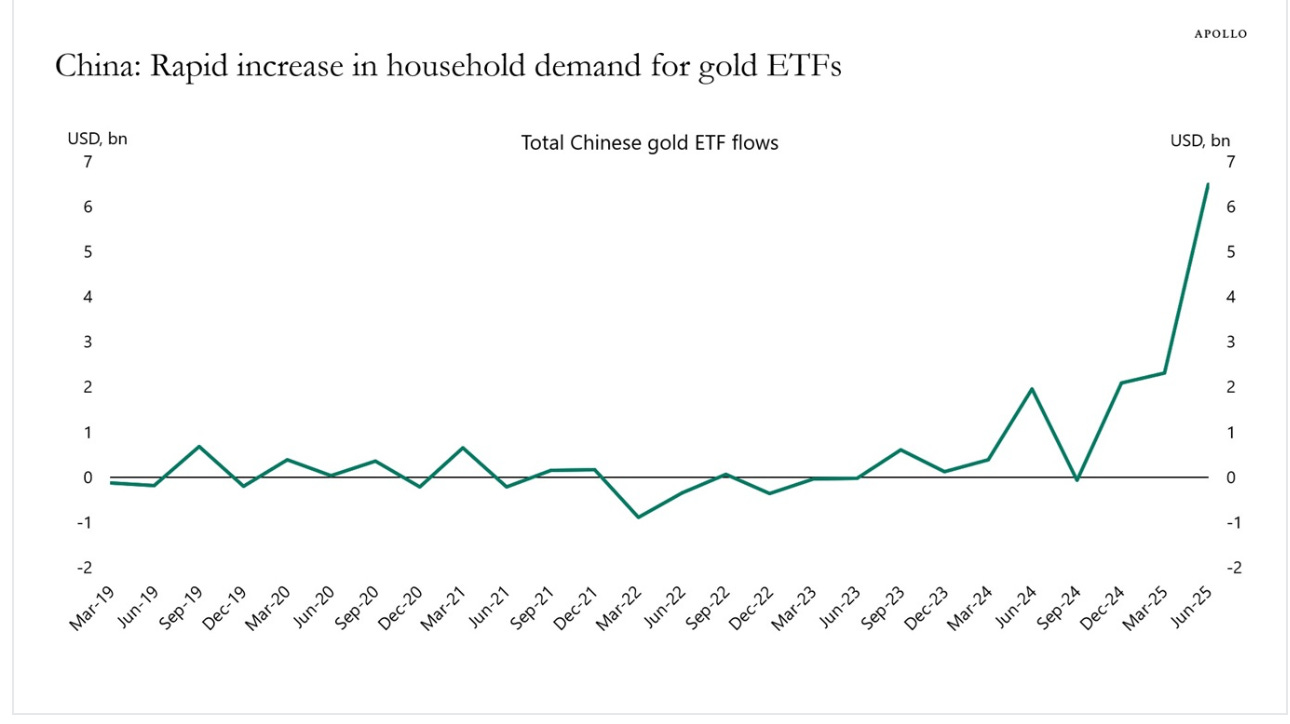 Demand for gold has increased significantly among households in China. This trend likely reflects the strong rally in gold prices, concerns about the ongoing decline in home prices, and worries about deflation and the weakening of the yuan, see chart below.