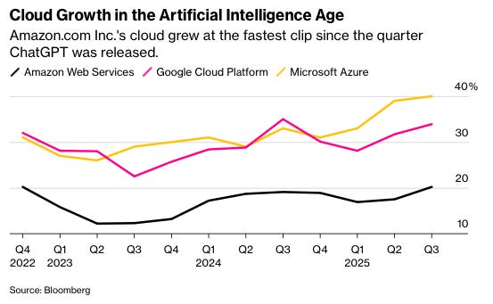 Amazon’s cloud division AWS reported its strongest growth since late 2022, with third-quarter revenue rising 20% to $33 billion and beating analyst expectations of 18% growth, helping ease investor concerns that the company was losing ground to Microsoft and Google in the AI-driven cloud market. The results sent Amazon shares surging 13% in extended trading as CEO Andy Jassy highlighted AI’s growing impact across the business, including projections that the Rufus shopping chatbot will generate $10 billion in additional annual sales and that the Bedrock AI marketplace could eventually rival AWS’s flagship EC2 computing service. Despite record capital expenditures of $34.2 billion—up 61% as Amazon doubles down on AI infrastructure and its $8 billion partnership with Anthropic—the strong performance across both cloud and retail operations reassured investors that massive AI spending wasn’t fueling a bubble but rather driving genuine business momentum.