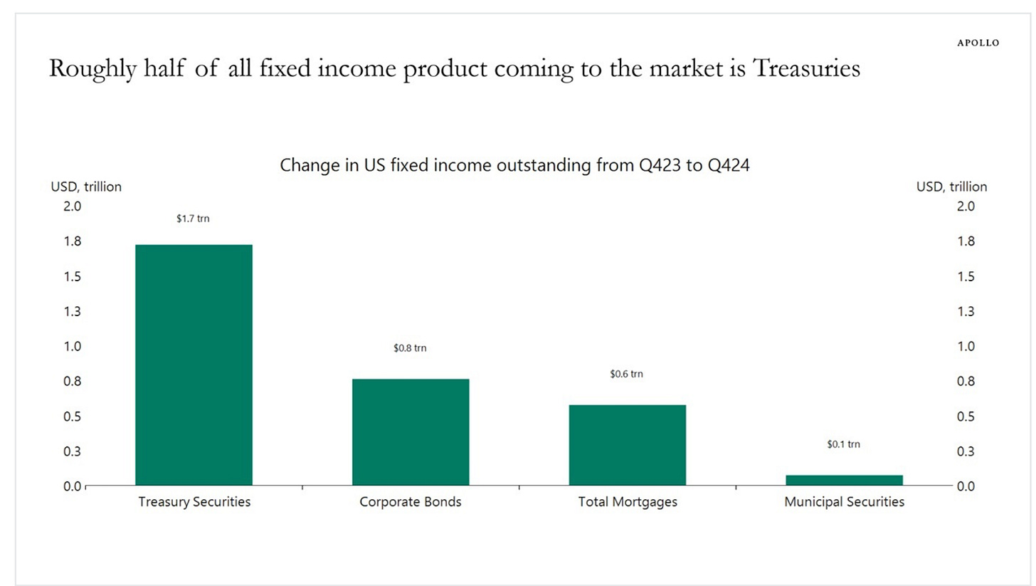 Over the past 12 months, roughly half of all fixed income product coming to the market has been Treasuries, see chart below.