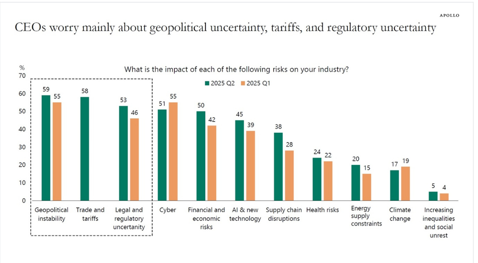 Surveys show that the top three risks for CEOs are geopolitical instability, trade and tariffs, and legal and regulatory uncertainty, see chart below.
