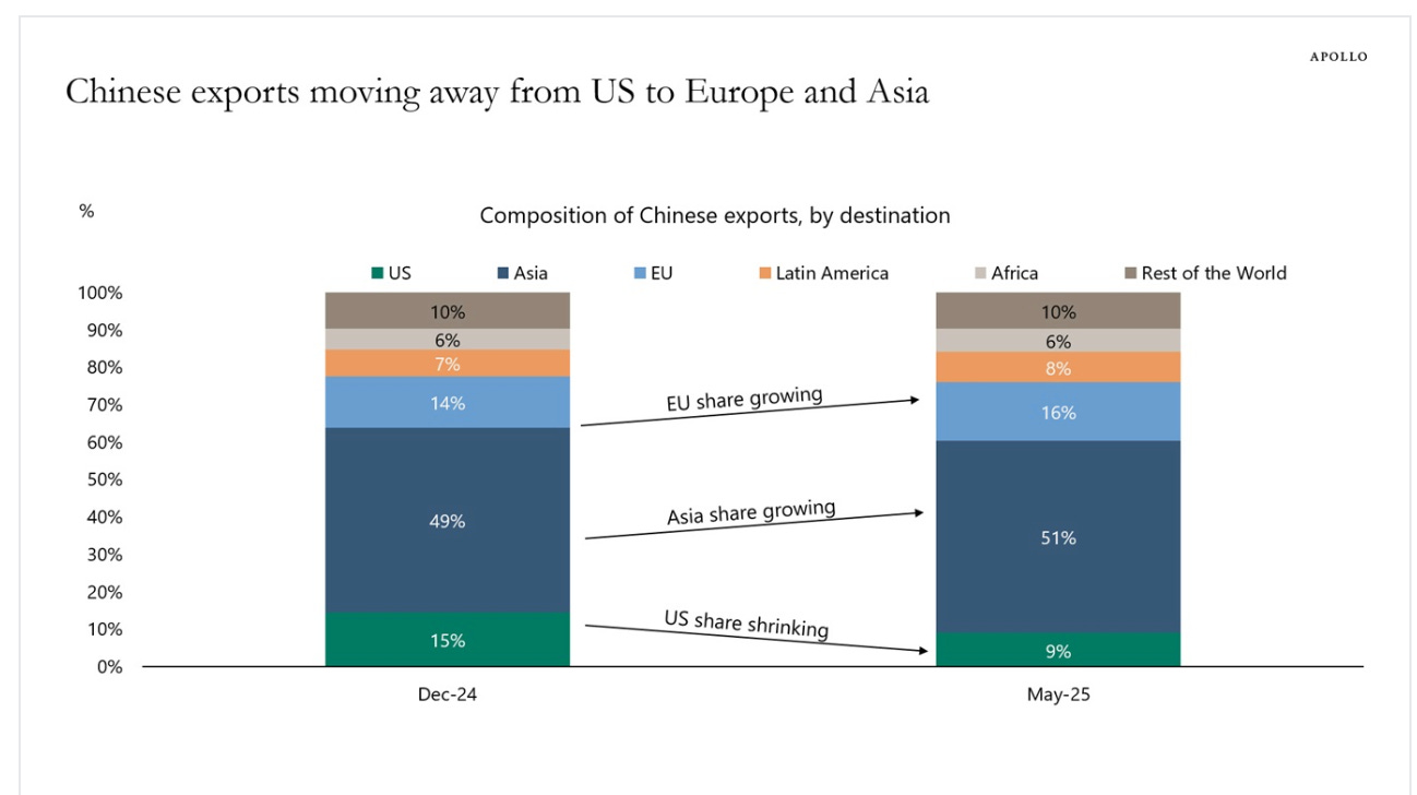 Since December 2024, the share of China’s exports going to the US has declined from 15% to 9%, while the shares of Chinese exports to Asia, Europe, and Latin America have increased, see chart below.