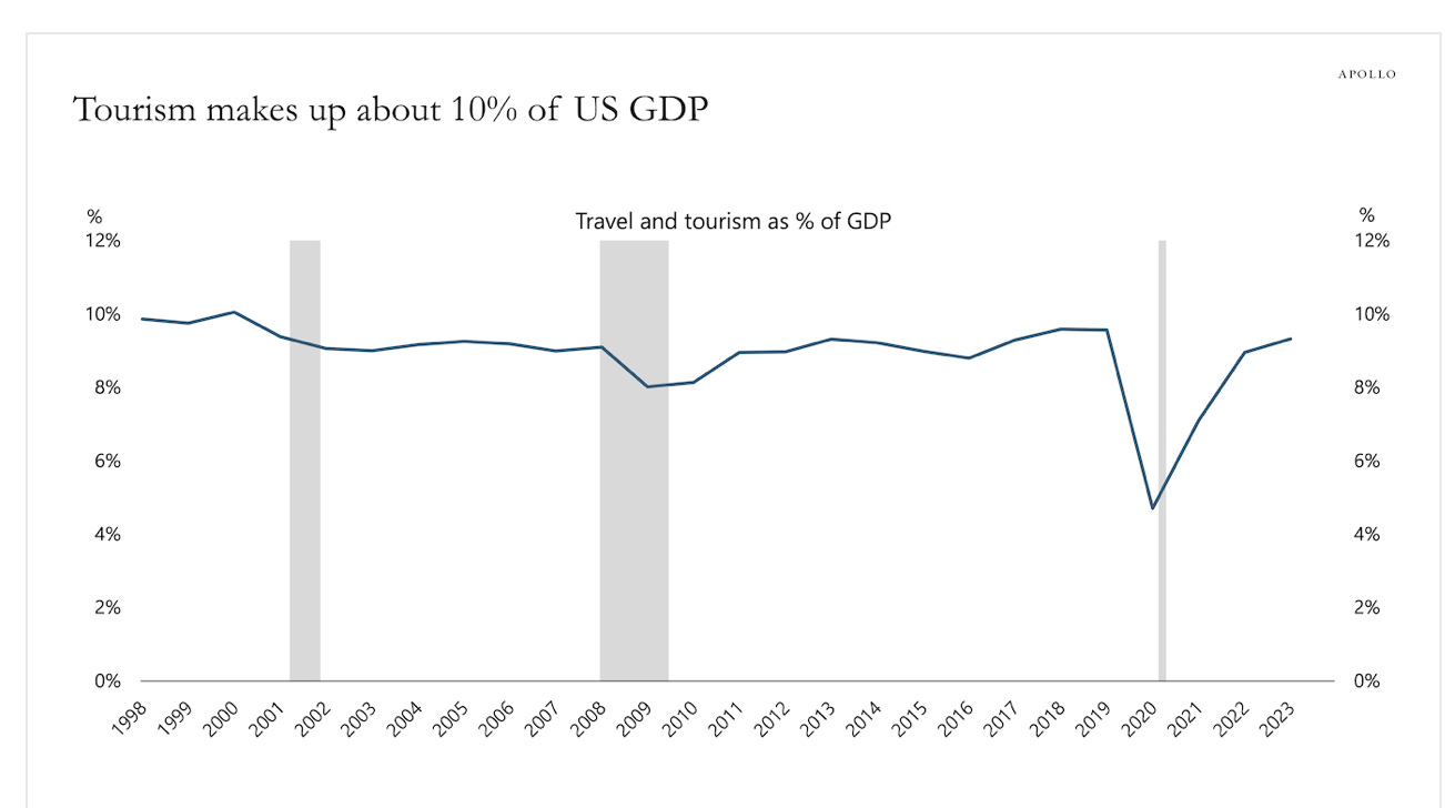 Following the recent US-China trade agreement, which sharply reduced tariffs and eased the risk of a complete trade breakdown, the probability of a US recession in 2025 has dropped to 30%, effectively removing the extreme downside risk tied to a total collapse in bilateral trade. The primary focus for markets now is how rapidly trust and confidence will return among consumers, businesses, and international investors, with the pace of this recovery-whether swift or prolonged over several quarters or years-remaining uncertain. Tourism is a particularly sensitive sector to watch; it accounts for roughly 9% of US GDP, and the country is projected to lose $12.5 billion in travel revenue this year due to a 22% decline in international visitor spending since 2019, with notable drops in arrivals from Canada and Europe negatively impacting airlines, hotels, and restaurants. While financial markets may rebound quickly from the trade turmoil, restoring confidence among consumers, corporations, and foreign stakeholders is likely to be a slower process, especially given the ongoing weakness in travel demand and persistent negative perceptions abroad.