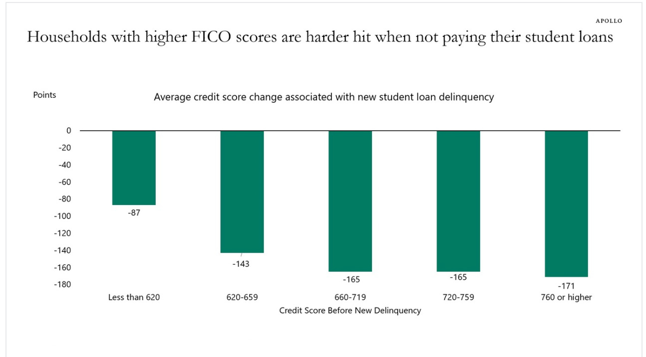 When households stop paying their student loans, their credit scores will go down. The chart below shows that for households with a FICO score higher than 760, the average credit score change associated with a new student loan delinquency is a decline of 171 points.