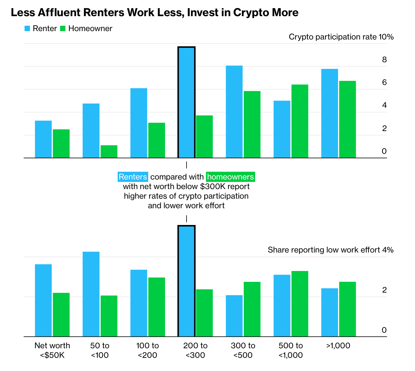 Bloomberg, using the Federal Reserve’s Survey of Consumer Finance data, built a model tracking financial trajectories from age twenty to seventy-five. The findings were stark: people who forgo homeownership end up with significantly less net worth over their lifetimes. That part isn’t surprising — home equity has long functioned as the primary savings vehicle for middle-class families. What was surprising was what people who gave up on homeownership did instead. Renters with net worth under $300,000 reported higher rates of cryptocurrency participation and lower overall work effort than homeowners at comparable wealth levels. The model suggested that “giving up” doesn’t just change where the money goes — it changes how people think about money, work, and the future altogether.