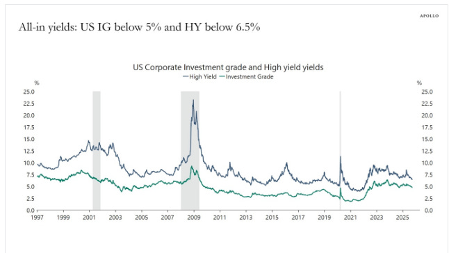 The all-in yield for public IG is now below 5%, and the all-in yield for public HY is below 6.5%, see chart below.
