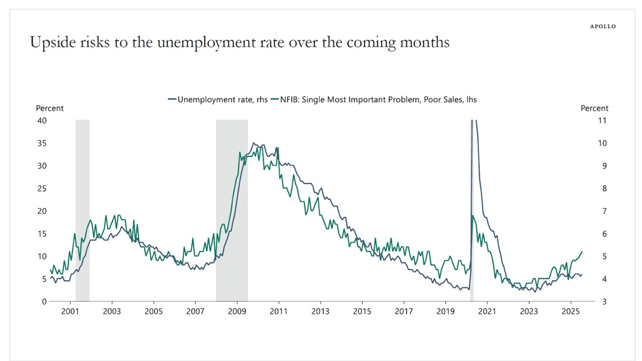 Second, small businesses saying that they are experiencing poor sales has also been a leading indicator for the unemployment rate, and the current reading suggests the unemployment rate could rise over the coming months, see the second chart.