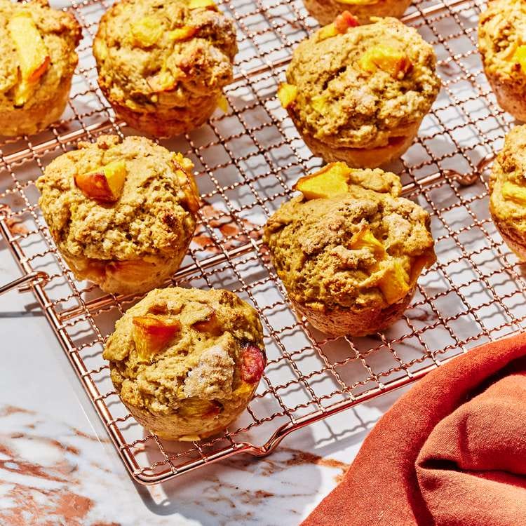 For the full recipe: https://www.eatingwell.com/high-protein-peach-muffins-8674794