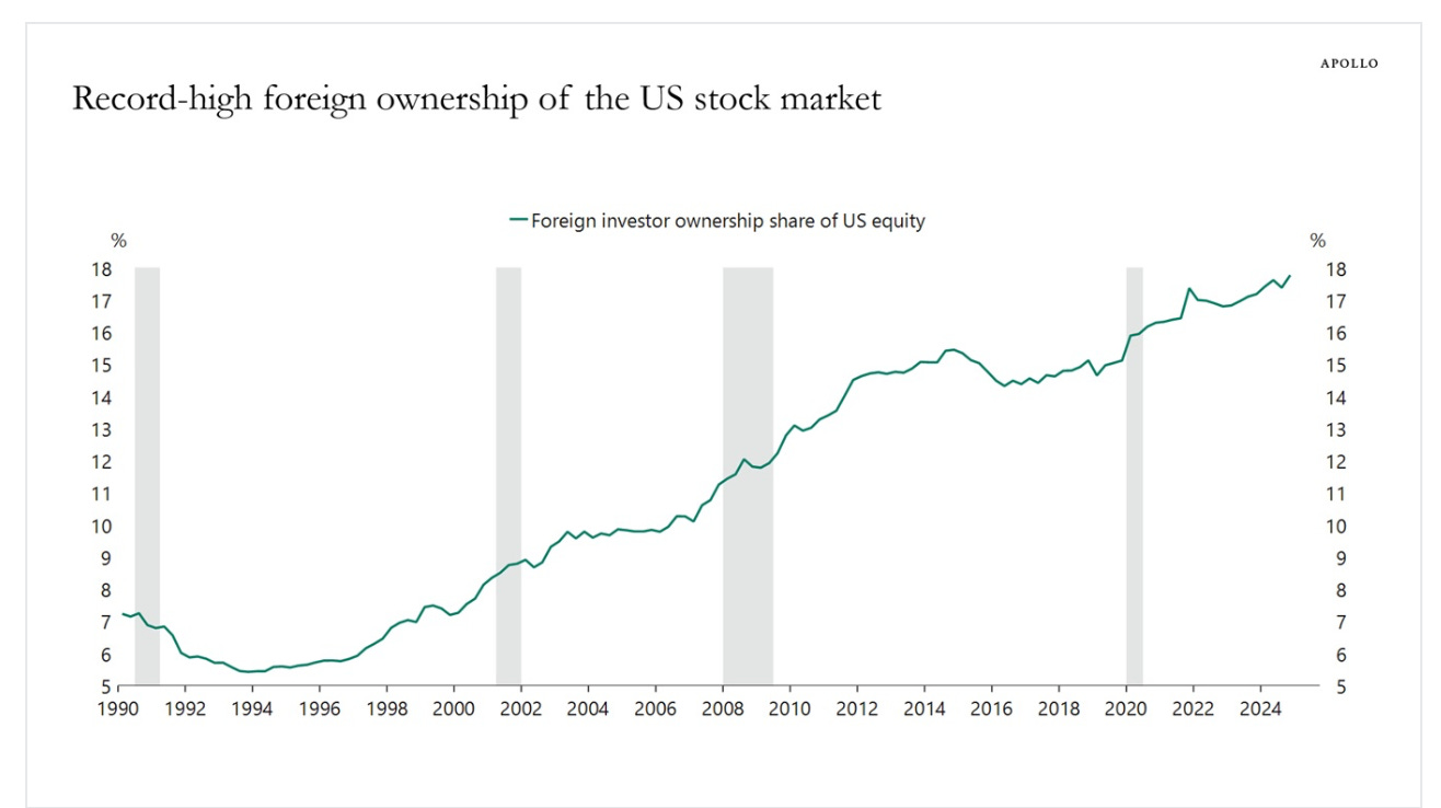 Foreigners have steadily increased their holdings of US equities and currently own 18% of the US stock market, see chart below.