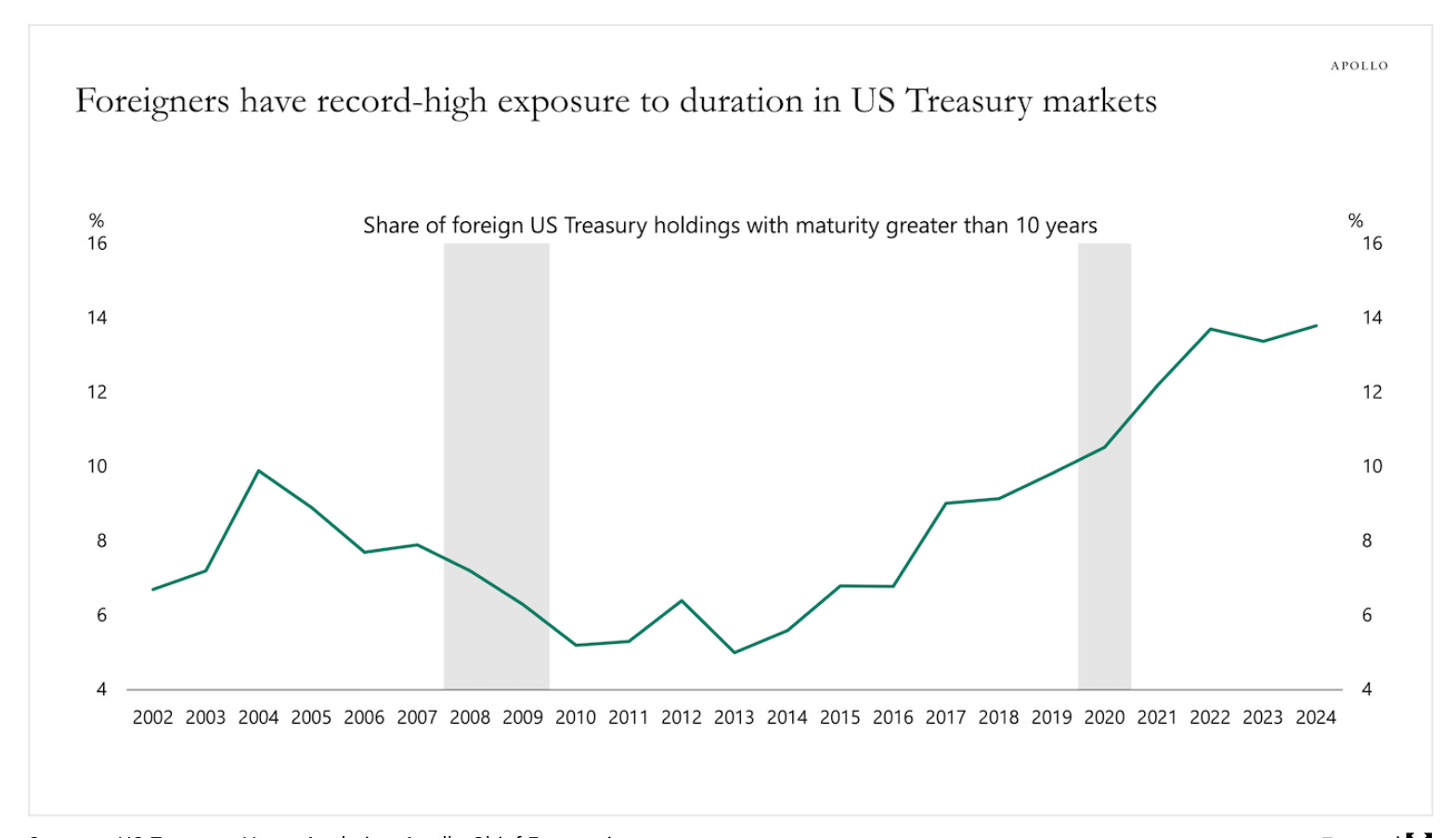 Why have foreigners over the past decade increased their exposure to US duration? Because of the prolonged period of low and negative interest rates in Europe and Japan. Global investors like high nominal yields.