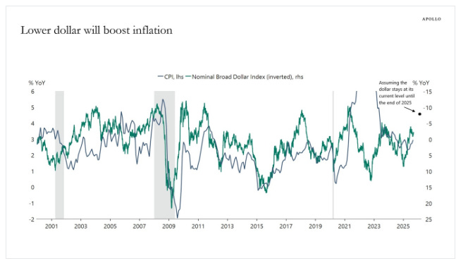 The US dollar has depreciated almost 10% since the beginning of the year, and the Fed’s model for the US economy finds that a 10% depreciation results in a 0.3% boost to inflation. Put differently, there is not only upward pressure on inflation from tariffs and immigration restrictions but also from the ongoing dollar depreciation, see chart below.