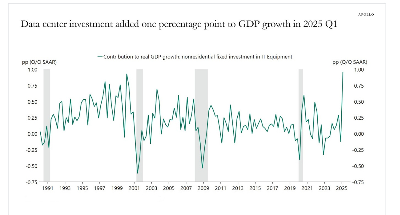 Data center construction added one percentage point to GDP growth in the first quarter, see chart above. This will be a strong tailwind to US economic growth over the coming years.