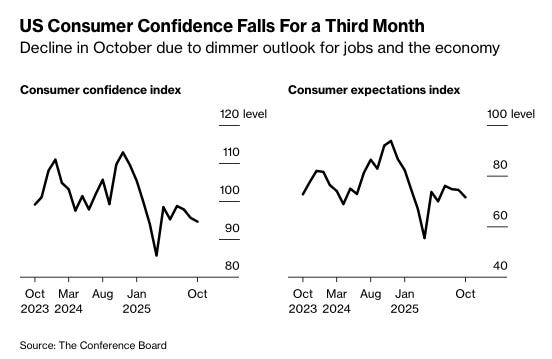 US consumer confidence fell for a third consecutive month in October to 94.6, the lowest level since April, driven by dimmer views on the economy and labor market outlook despite present conditions improving slightly. The Conference Board’s expectations index dropped to 71.5, its lowest since June, with more consumers anticipating fewer available jobs in the next six months and less positive income prospects, even as the gap between those finding jobs plentiful versus hard to get widened.
